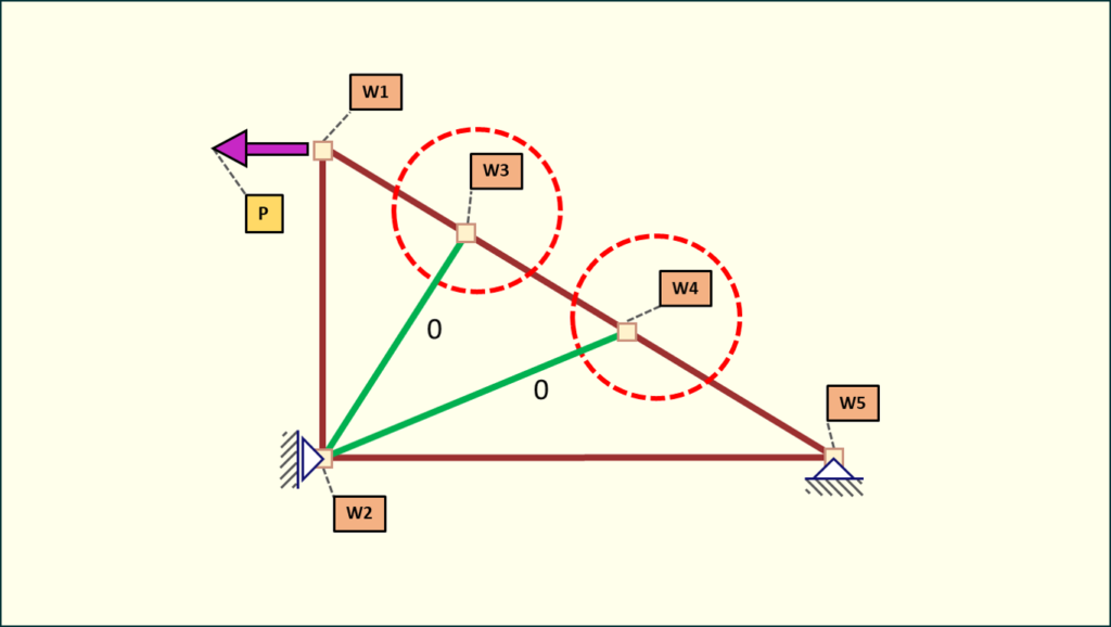 Jeżeli mamy dwa pręty połączone węzłem (pod dowolnym kątem) i węzeł ten jest obciążony siłą, która jest w tej samej linii co jeden z prętów, wtedy drugi pręt jest zerowy.