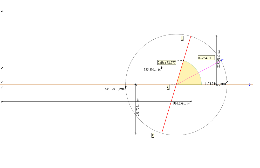 Z punktu C zakreślamy okrąg o promieniu R=264,9119 cmR = 264{,}9119\ \mathrm{cm}. Okrąg ten wyznacza na osi X punkty JminJ_{min} i JmaxJ_{max}.