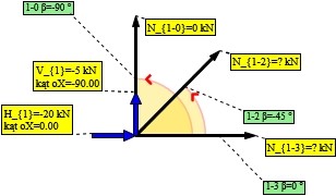 Obliczenia rozpoczynamy od węzła, dla którego liczba niewiadomych sił w prętach jest najmniejsza i wynosi maksymalnie 2.