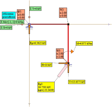 Sprawdzenia poprawności wyznaczenia reakcji podporowych dokonamy w punkcie [(-1); (-1)] w układzie XY.