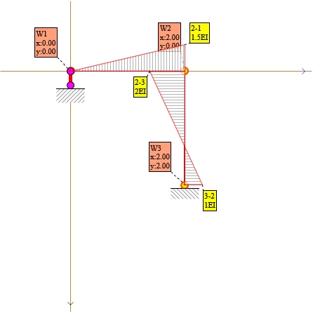 - Węzeł 2: x = 2.000 m, y = 0.000 m
