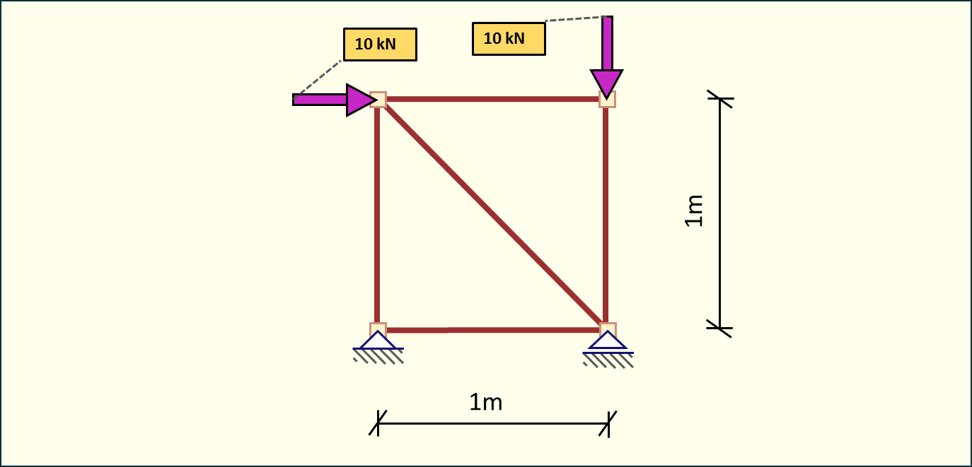 Rozpatrzmy kratownicę przedstawioną poniżej. Celem jest obliczenie sił w poszczególnych prętach.