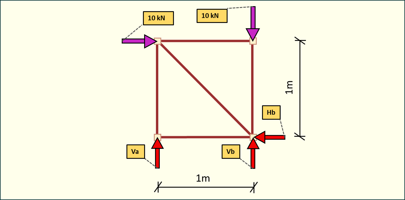 VA1m+10 kN1m=0V_A \cdot 1m + 10\ kN \cdot 1m = 0