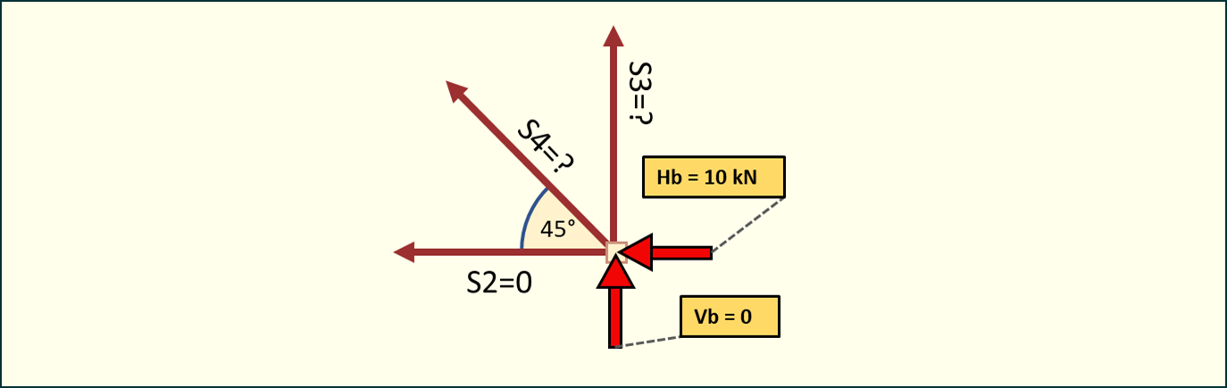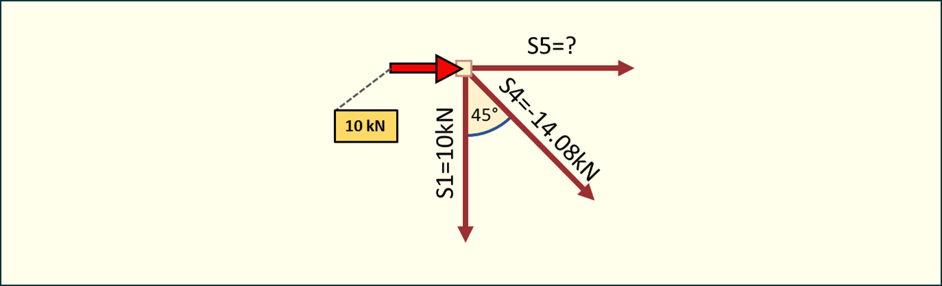 10 kN+S4cos(45°)+S5=010\ kN + S_4 \cdot \cos(45°) + S_5 = 0