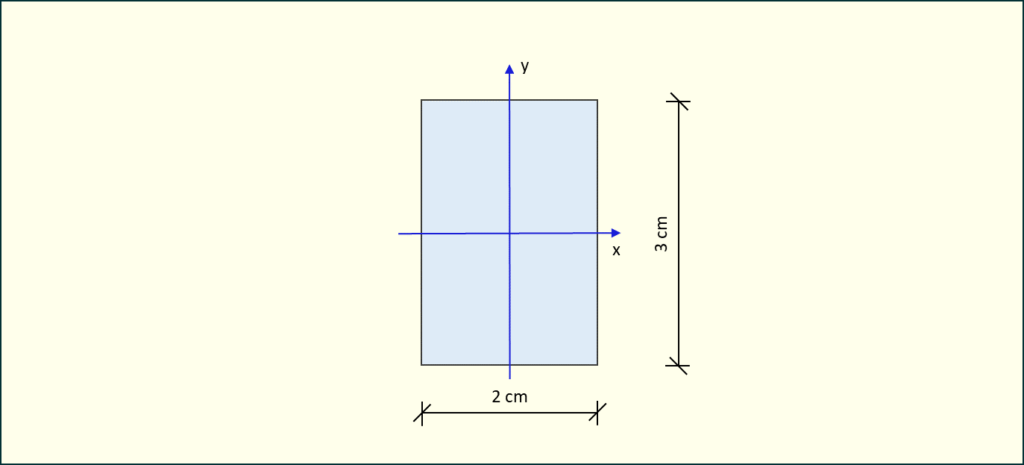 Jx=bh312=2 cm3 cm312=4,5 cm4J_x = \frac{b \cdot h^3}{12} = \frac{2\ cm \cdot 3\ cm^3}{12} = 4{,}5\ cm^4Jy=hb312=3 cm2 cm312=2 cm4J_y = \frac{h \cdot b^3}{12} = \frac{3\ cm \cdot 2\ cm^3}{12} = 2\ cm^4