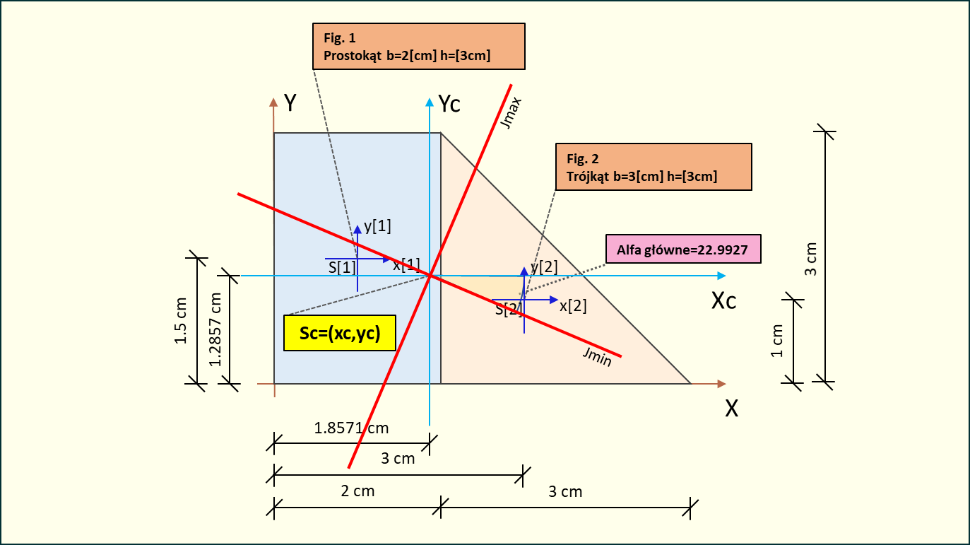 W przedstawionym przykładzie wykonaliśmy kompletne obliczenia charakterystyk geometrycznych układu składającego się z prostokąta i trójkąta. Wyznaczyliśmy położenie środka ciężkości układu w punkcie cm, centralne momenty bezwładności ( cm⁴, cm⁴, cm⁴), kąt obrotu głównych osi bezwładności () oraz główne centralne momenty bezwładności ( cm⁴, cm⁴). Poprawność obliczeń została potwierdzona przez sprawdzenie niezmienników i , które w obu przypadkach wyniosły zero, co świadczy o prawidłowym wykonaniu wszystkich kroków obliczeniowych.