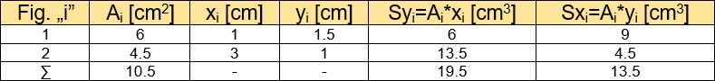 Mając wszystkie potrzebne dane możemy zatem obliczyć odległości między środkami ciężkości poszczególnych figur a środkiem ciężkości całego układu: