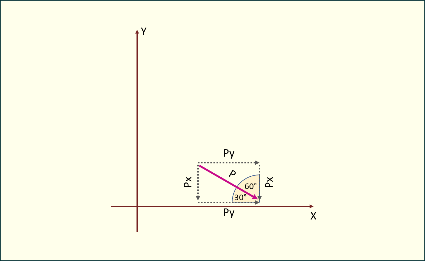 sin60°=PyPPy=Psin60°\sin 60° = \frac{P_y}{P} \rightarrow P_y = P \cdot \sin 60°cos60°=PxPPx=Pcos60°\cos 60° = \frac{P_x}{P} \rightarrow P_x = P \cdot \cos 60°
