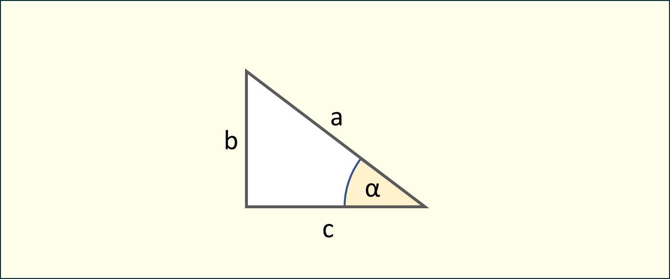 sinα=bab=asinα\sin \alpha = \frac{b}{a} \rightarrow b = a \cdot \sin \alphacosα=cac=acosα\cos \alpha = \frac{c}{a} \rightarrow c = a \cdot \cos \alpha