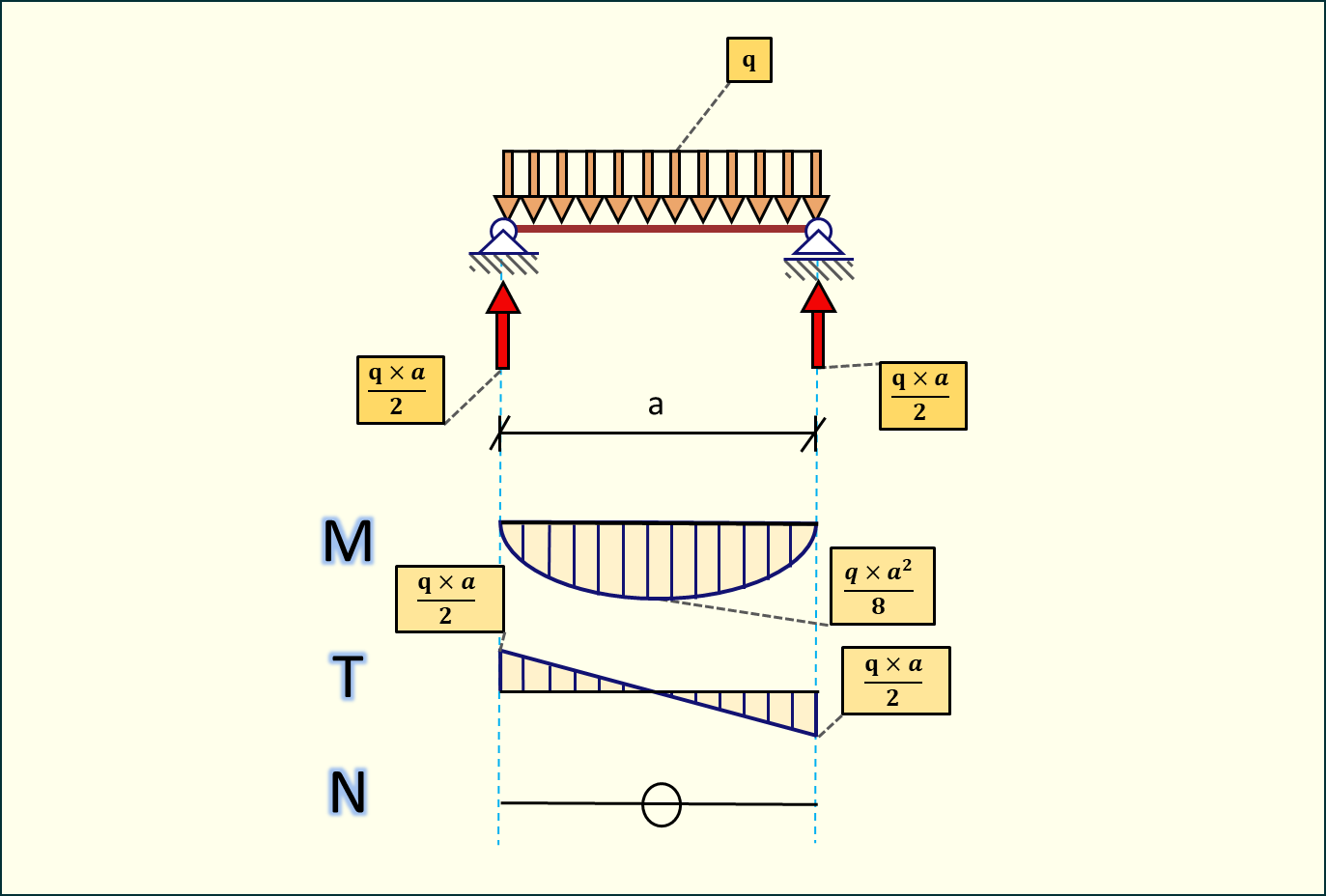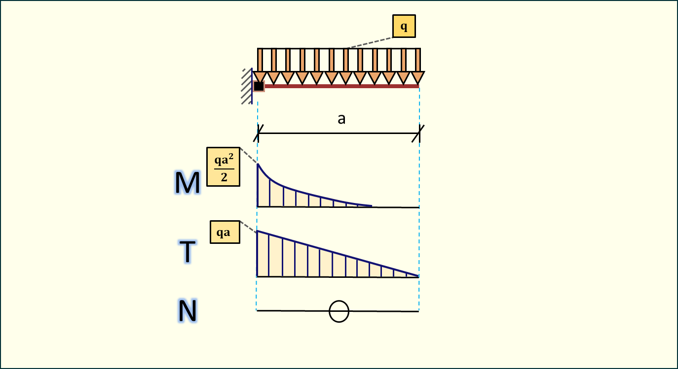 Mmax=qa21212a=qa28M_{max} = \frac{q \cdot a}{2} \cdot \frac{1}{2} \cdot \frac{1}{2} \cdot a = \frac{q \cdot a^2}{8}