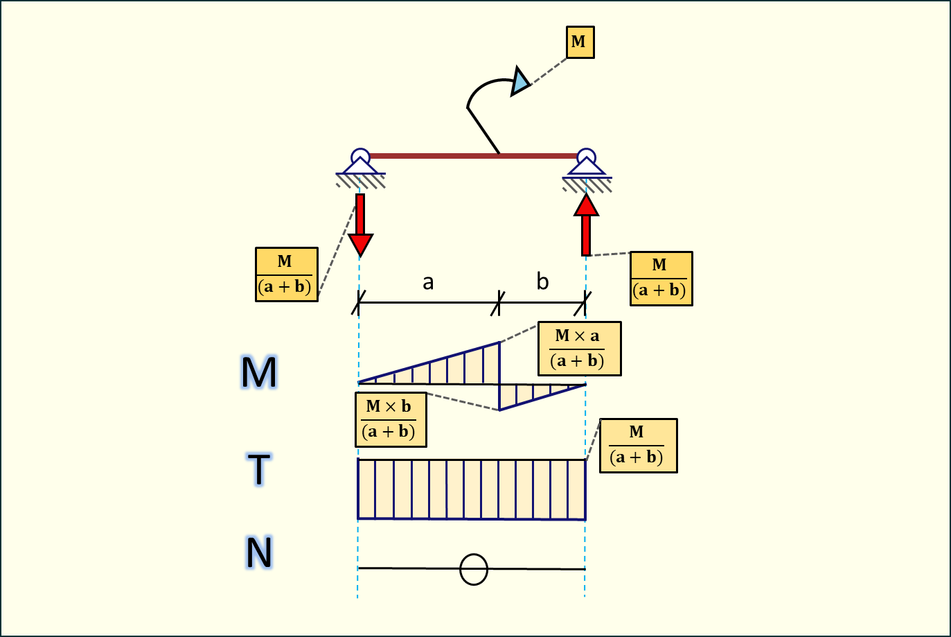 Wartość reakcji podporowych jest równa wartości momentu podzielonej przez długość całkowitą belki. Siły tnące równe są wartości reakcji podporowych. Wartości momentów liczymy mnożąc wartość reakcji podporowej przez odległość pomiędzy podporą, a punktem przyłożenia momentu.